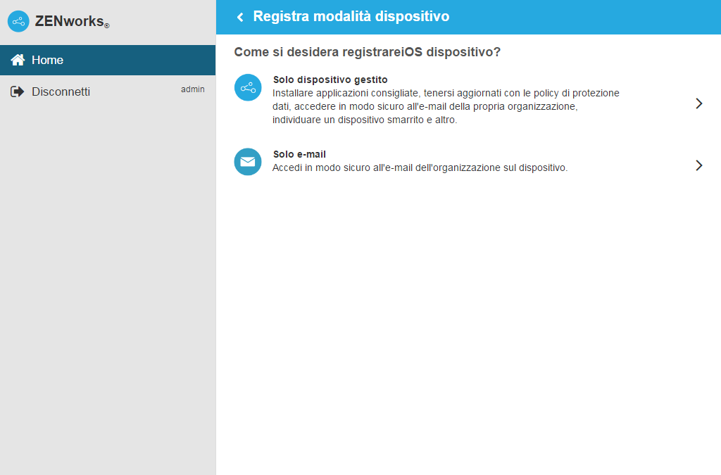Questo scenario mostra come registrare un dispositivo come dispositivo Solo e-mail nella zona di gestione ZENworks. In questo scenario è riportata la procedura dettagliata per registrare un dispositivo iOS come dispositivo Solo e-mail.