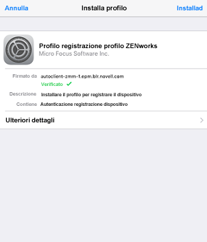 Il profilo di registrazione del dispositivo ZENworks contiene il profilo MDM richiesto per la gestione del dispositivo da parte di ZENworks.
