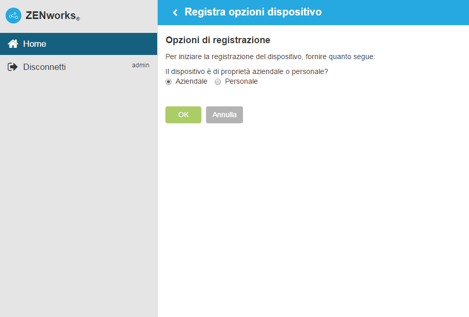 Se si è configurata la policy di registrazione dispositivo mobile per consentire all'utente di specificare la proprietà del dispositivo (aziendale o personale), viene richiesto di specificare tali informazioni. Toccare OK. Il dispositivo viene registrato automaticamente nella zona.