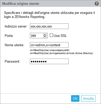 Nome utente: per ZENworks Reporting Server è richiesto l'accesso in sola lettura alla directory LDAP per autenticare ogni tentativo di login. Per ottenere l'accesso in sola lettura vengono utilizzate le credenziali dell'utente specificato.