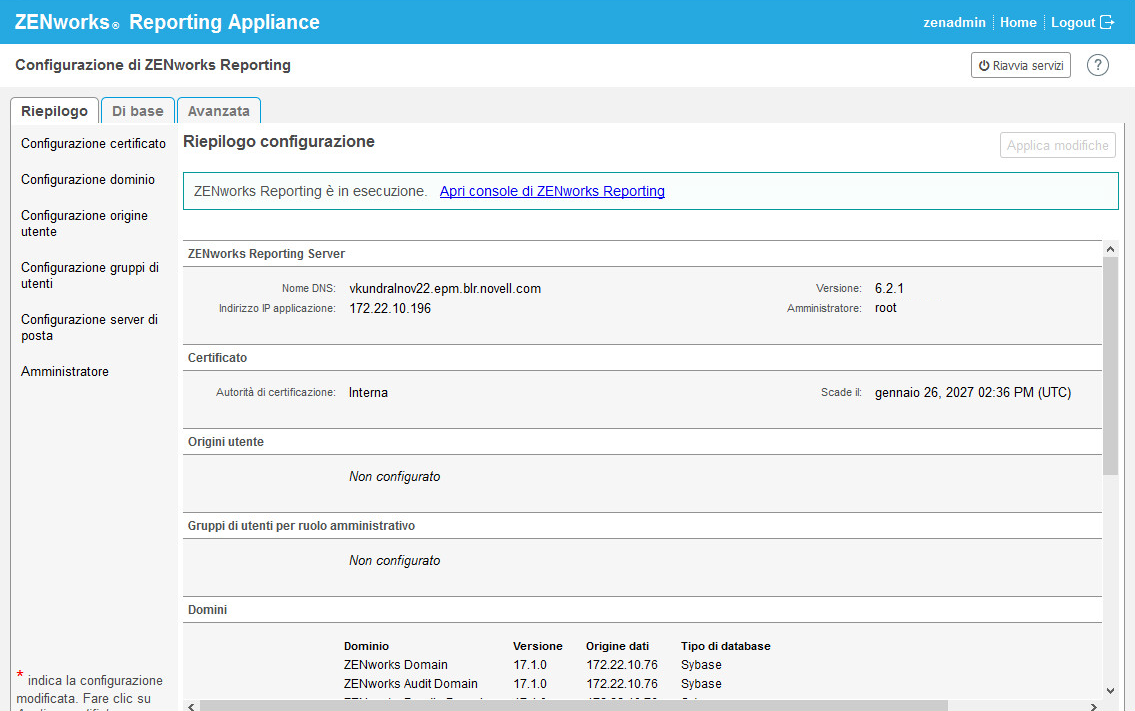 Per riconfigurare i domini, vedere la Sezione 4.1, Configurazione di ZENworks Reporting, al Passaggio 10.