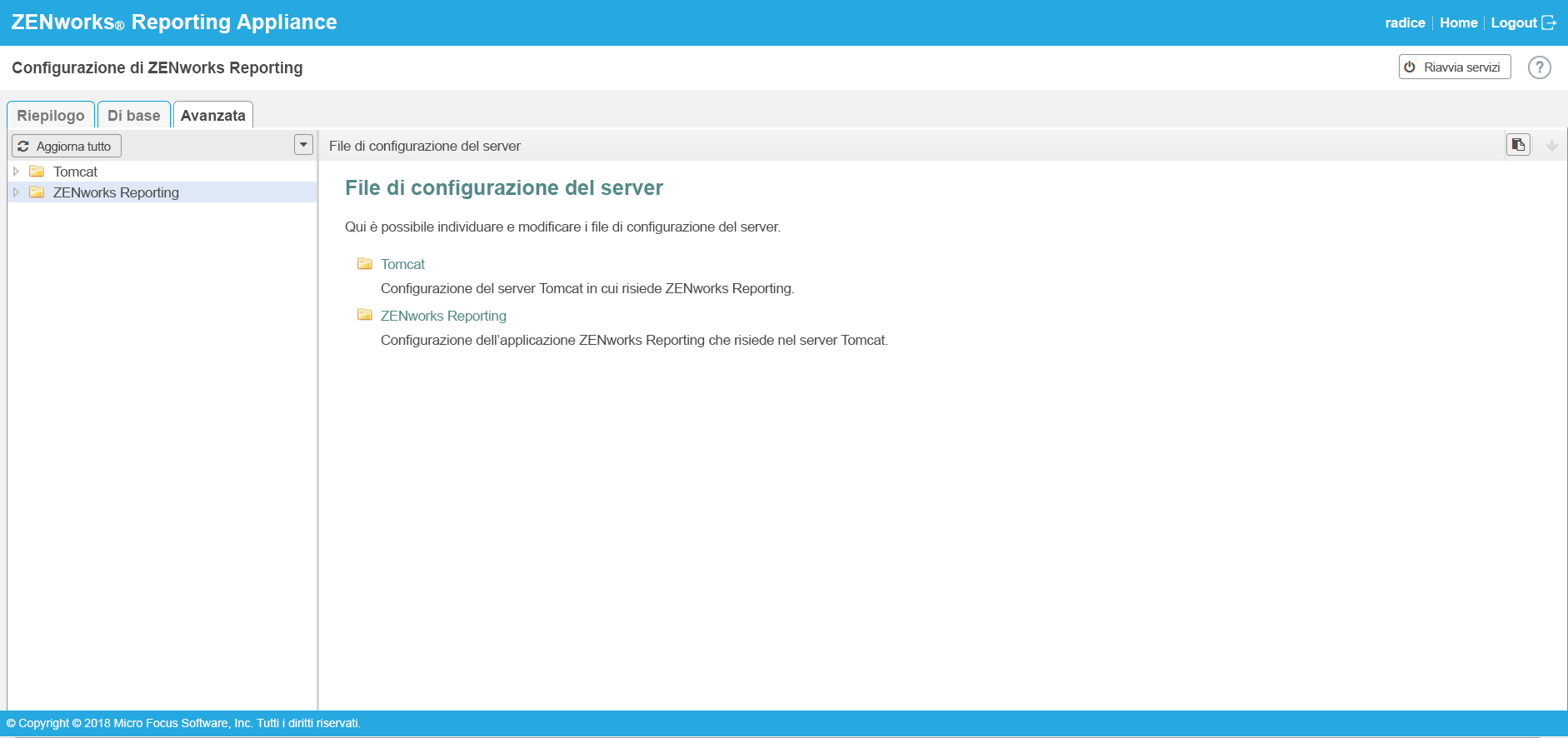 La vista Avanzata consente di visualizzare, configurare o modificare qualsiasi file di configurazione del server relativo a ZENworks Reporting, come Tomcat e ZENworks Reporting.