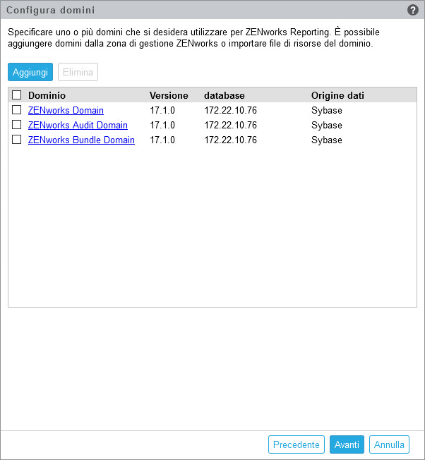 Specificare uno o più domini che si desidera utilizzare per ZENworks Reporting. È possibile aggiungere domini dalla zona di gestione ZENworks o importare file di risorse del dominio.