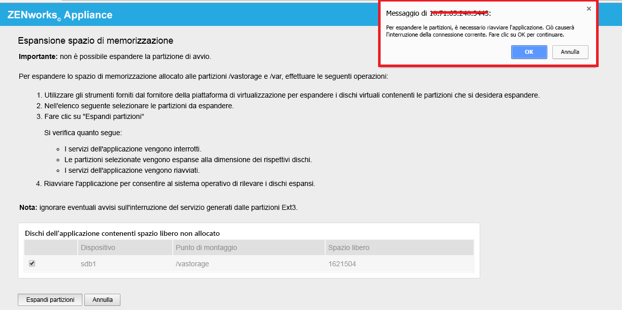 Dopo aver fatto clic su Espandi partizioni, verrà visualizzato un messaggio popup del browser.