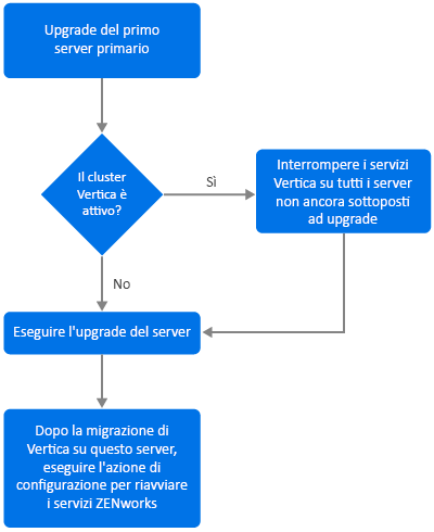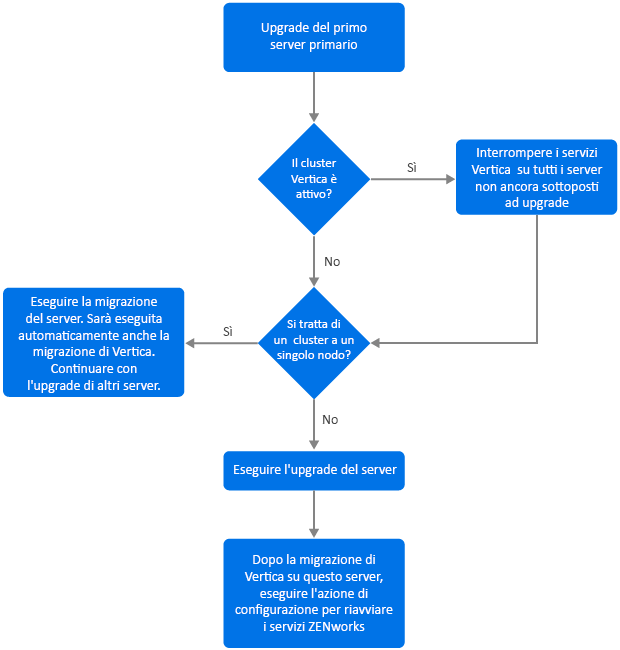 Dopo l'upgrade, la zona verrà eseguita con funzionalità limitate fino al completamento del processo per tutti i server in cui Vertica è abilitato. Al termine dell'upgrade di tutti i server in cui Vertica è abilitato, eseguire l'azione di configurazione microfocus-zenworks-configure -c Start per riavviare i servizi ZENworks sul primo server primario sottoposto ad upgrade.