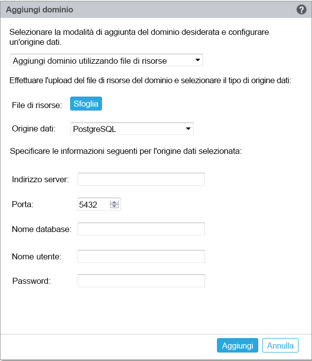 Nella pagina Aggiungi dominio, selezionare come si desidera aggiungere il dominio e configurare un'origine dati.