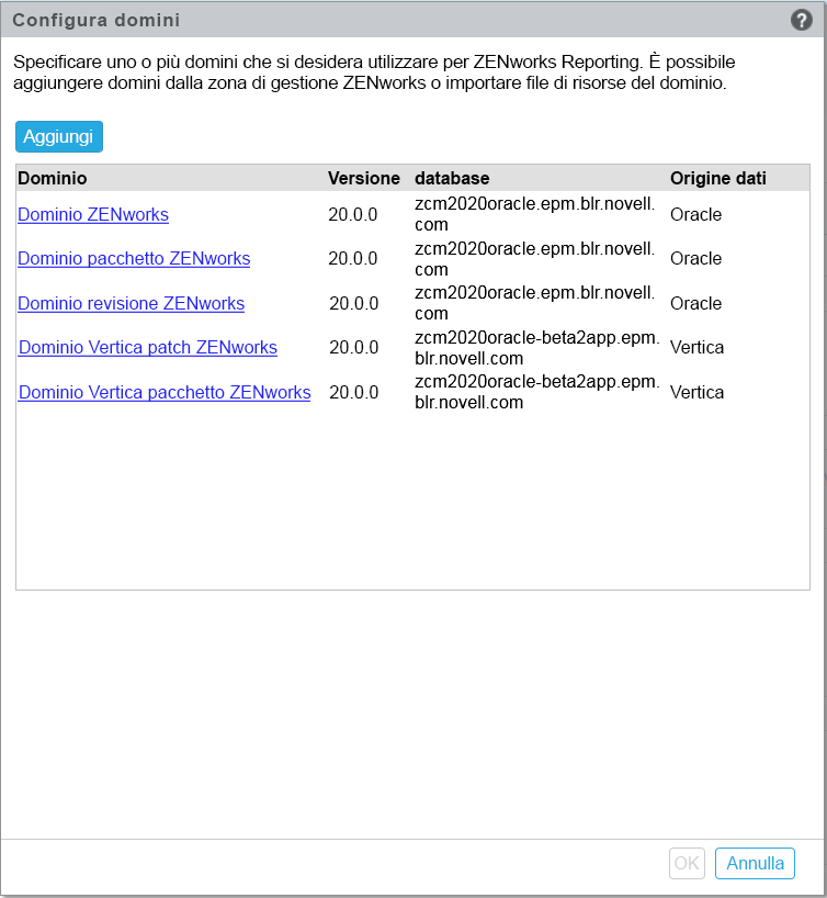 Specificare uno o più domini che si desidera utilizzare per ZENworks Reporting. È possibile aggiungere domini dalla zona di gestione ZENworks o importare file di risorse del dominio.