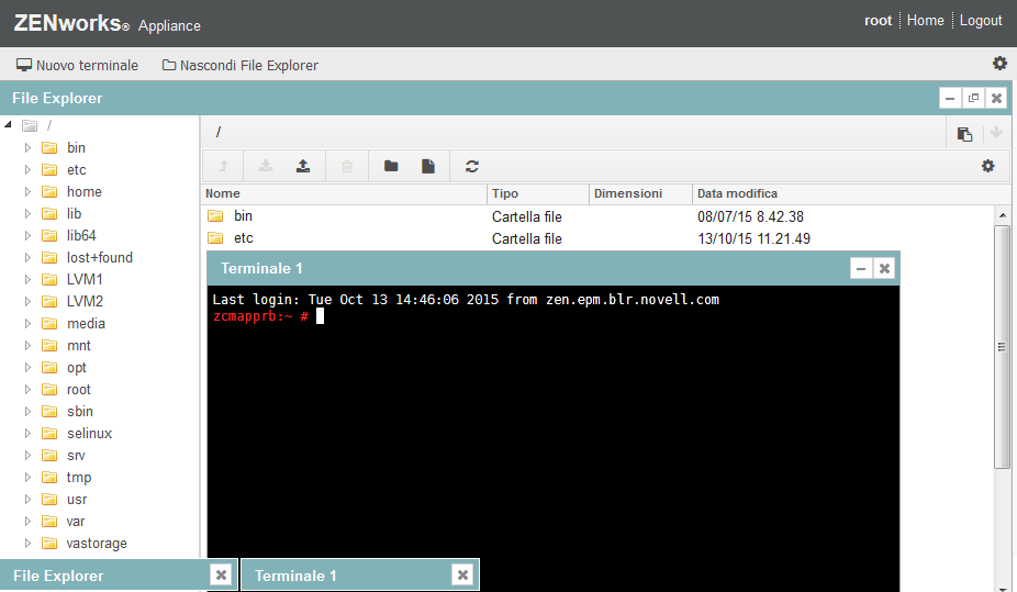 Se si esegue il login come utente zenadmin o root è possibile aprire una sessione del terminale. L'utente zenadmin può eseguire comandi ZENworks come zman, zac e novell-zenworks-configure.