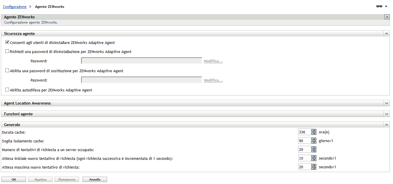 Per proteggere ZENworks Adaptive Agent sui dispositivi, è possibile configurare sia le impostazioni di disinstallazione che quelle di auto-difesa dell'agente.