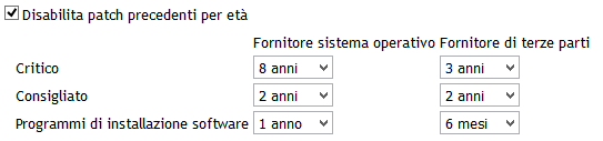 Disabilitazione dei contenuti per età: questa nuova opzione è stata aggiunta per la gestione dei contenuti obsoleti. È ora possibile disabilitare i contenuti precedenti a una scadenza selezionata. Questa funzione impedisce di distribuire le patch obsolete e consente di ridurre l'ambito degli elenchi nella scheda Patch. Ad esempio, è possibile installare programmi di installazione di terze parti che si disabilitino automaticamente dopo sei mesi.