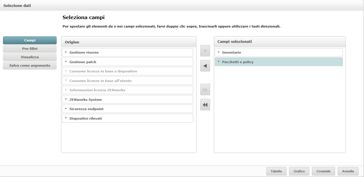 È necessario selezionare elementi da Origine in Campi selezionati, per abilitare i pulsanti Pre-filtri, Visualizza e Salva come argomento. Le funzioni Pre-filtri, Visualizza e Salva come argomento sono facoltative e possono essere utilizzate in qualsiasi ordine. Fare clic su Tabella, Grafico o Crosstab in qualsiasi momento per progettare una vista basata sui dati scelti.