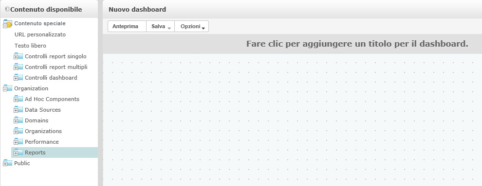 Nel riquadro Contenuto disponibile passare alla cartella richiesta, fare clic con il pulsante destro del mouse sul nome del rapporto e scegliere Aggiungi a dashboard o trascinare e rilasciare il rapporto da Contenuto disponibile a Visualizzatore dashboard.