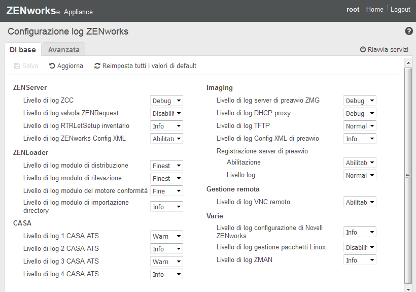 Nella vista Avanzata viene caricato il file di configurazione dei log dei componenti di ZENworks che può essere modificato per eseguire il debug dei problemi che si verificano nell'ambiente del cliente. Dopo aver modificato il file di configurazione, è possibile riavviare i servizi. È anche possibile elencare i file modificati e i processi che richiedono il riavvio.