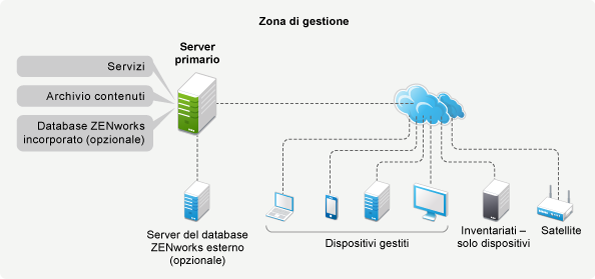 Tutti i prodotti ZENworks utilizzano la stessa architettura di sistema. Tale architettura è formata da componenti quali server primari, server satellite e dispositivi gestiti. I componenti sono organizzati in domini di gestione denominati zone di gestione.