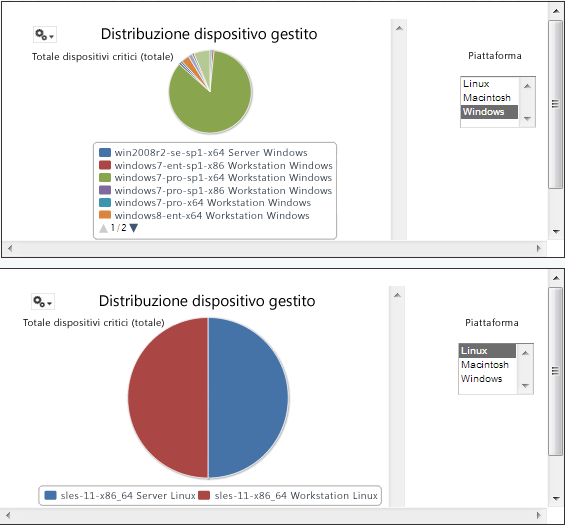 Nel dashboard mostrato di seguito lo stesso dashboard viene utilizzato con due controlli di input diversi, uno con la piattaforma Windows e l'altro con la piattaforma Linux. In questo esempio viene mostrato il numero di dispositivi che utilizzano versioni diverse dei sistemi operativi Windows e Linux.