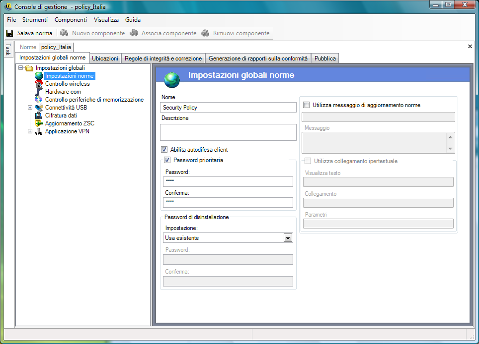 Password di disinstallazione: Si consiglia di installare tutti gli ZENworks*Security Client con una password di disinstallazione per impedire agli utenti di disinstallare il software. La password in genere viene configurata al momento dell'installazione, tuttavia è possibile aggiornarla, abilitarla o disabilitarla mediante le norme.