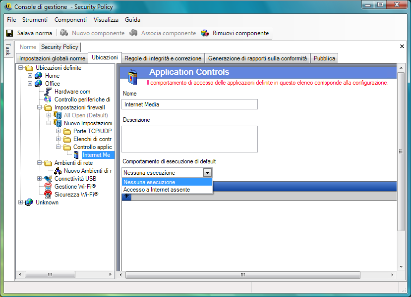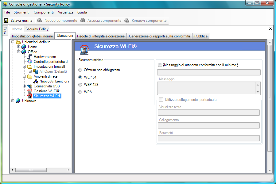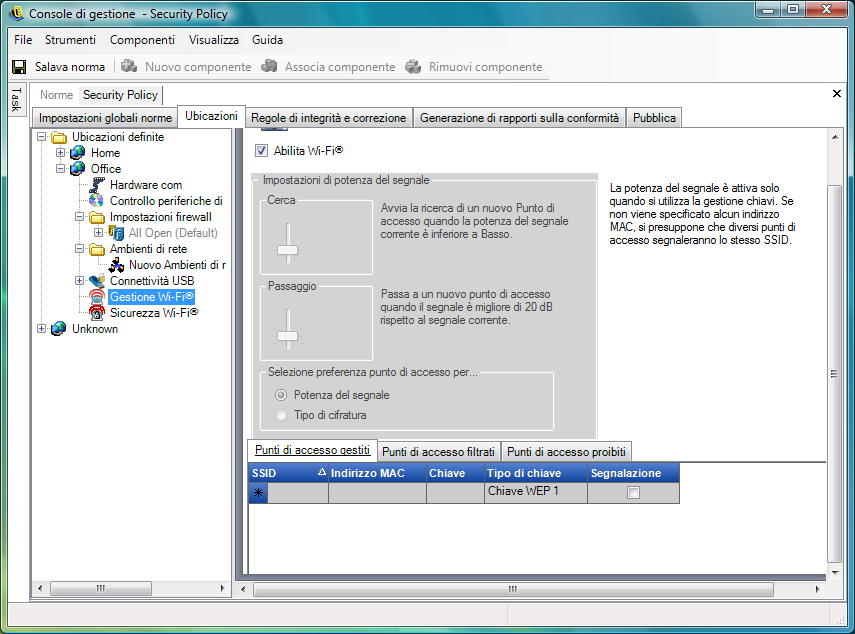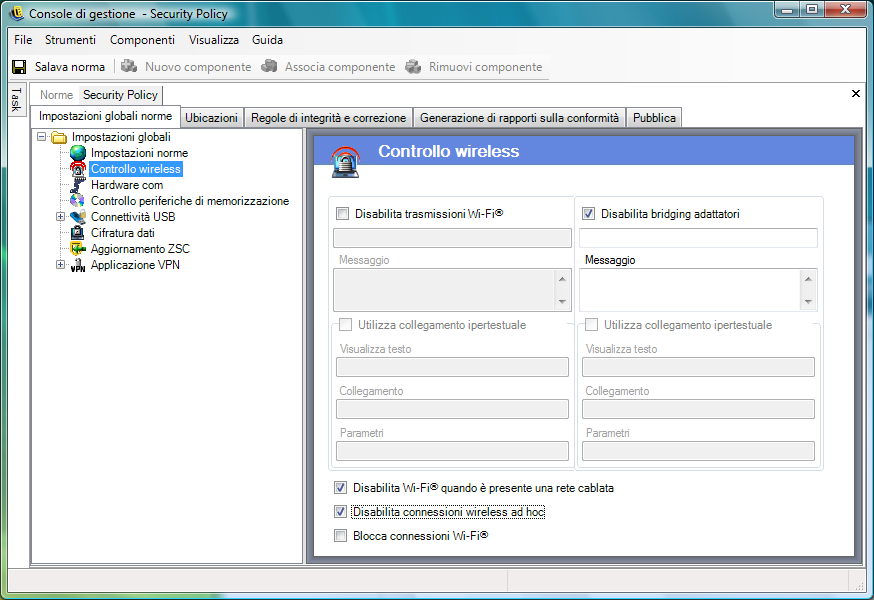 Controllo wireless imposta i parametri di connessione dell'adattatore a livello globale per garantire la sicurezza sia dei punti finali che della rete. Per accedere a questo controllo, fare clic sulla scheda , quindi sull'icona nell'albero delle norme a sinistra.