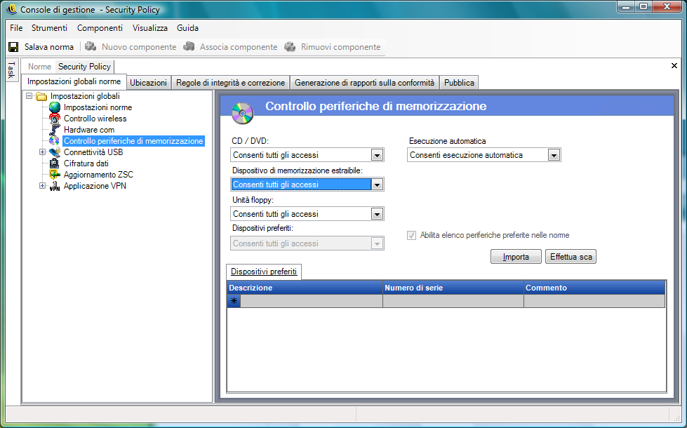 Dispositivi preferiti: Consente solo i dispositivi di memorizzazione estraibili elencati nella finestra Controllo periferiche di memorizzazione. Tutte le altre periferiche segnalate come estraibili non sono consentite.