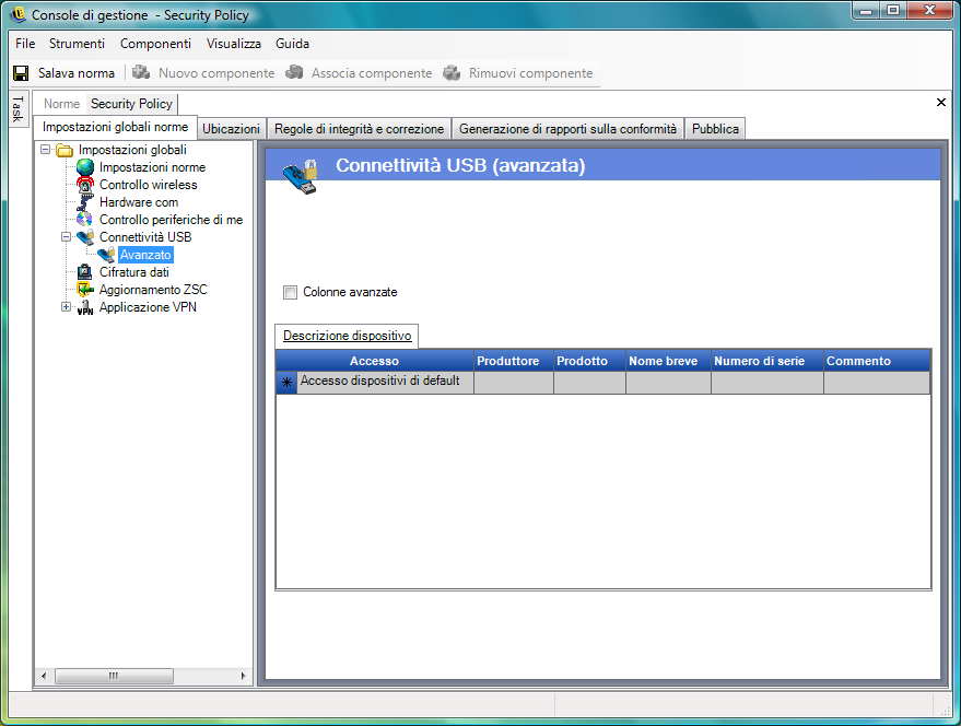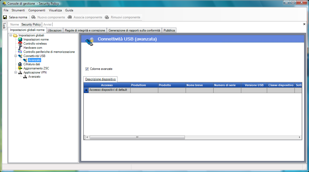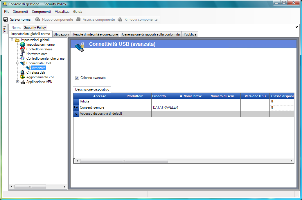 Nella gran parte dei casi, i quattro gruppi di dispositivi elencati nella pagina Connettività USB (Human Interface Device, Classe di memorizzazione di massa, Classe di stampa e Scansione/Imaging) sono sufficienti per consentire o negare l'accesso alla maggior parte dei dispositivi. Se si dispone di dispositivi che non rientrano in nessuno di questi gruppi, è possibile configurare le impostazioni nella pagina Connettività USB (avanzate). È inoltre possibile utilizzare questa impostazione nella pagina Avanzate per fornire un accesso White List a determinati dispositivi, anche se a questi ultimi può essere negato l'accesso in base alle impostazioni specificate nella pagina Connettività USB.