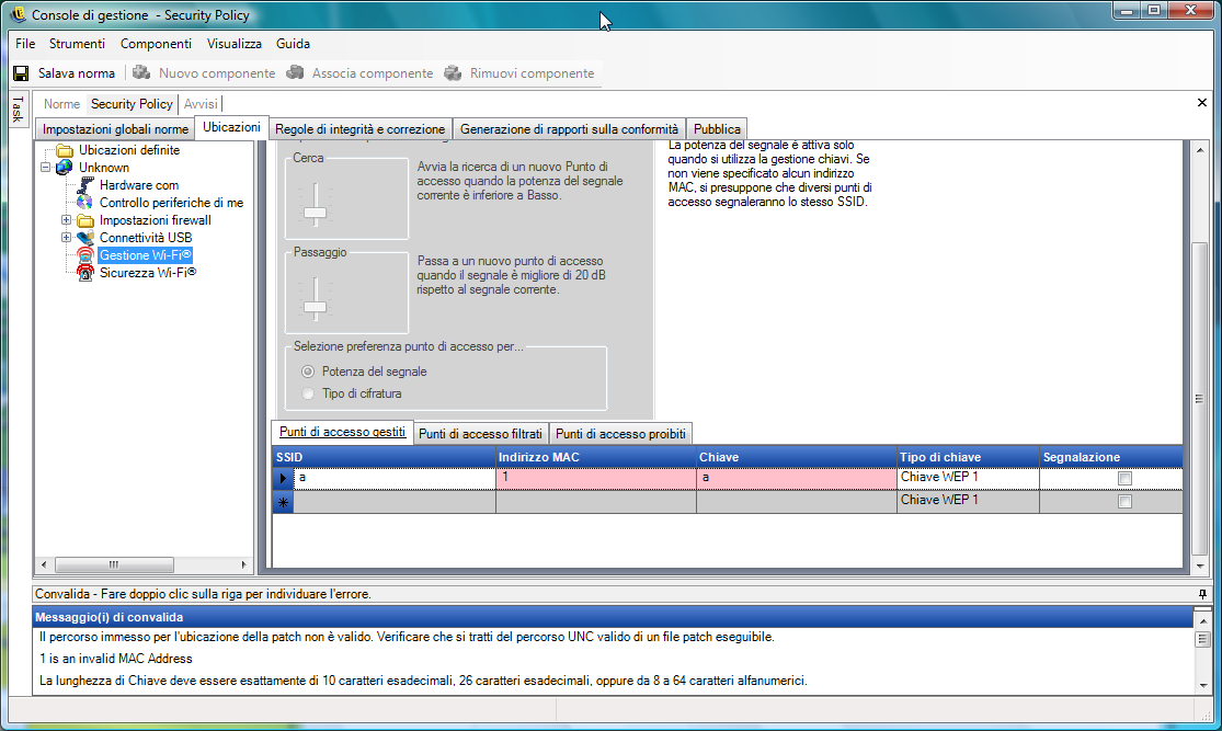 Quando l'amministratore tenta di salvare le·norme in un componente con dati incompleti o errati, nella parte inferiore della console di gestione viene visualizzato il riquadro Convalida, nel quale viene evidenziato ciascun errore. Ogni errore deve essere corretto prima di poter salvare le norme.