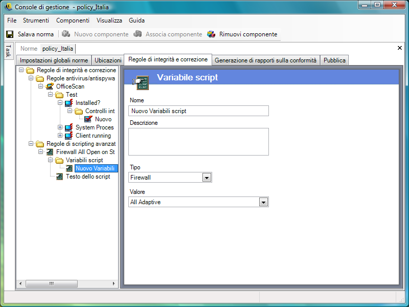 Si tratta di un'impostazione facoltativa che consente all'amministratore di definire una variabile (var) per lo script e di utilizzare una funzionalità diZENworks Endpoint Security Management (ad esempio, visualizzare messaggi utente personalizzati o collegamenti ipertestuali definiti, passare a un'ubicazione o a un'impostazione del firewall definita), oppure di modificare il valore della variabile senza modificare lo script stesso.