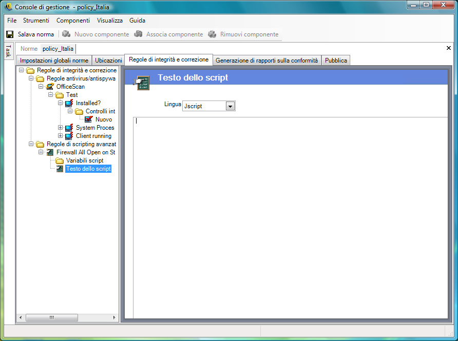 Selezionare il tipo di script (Jscript o VBscript) e immettere il testo nel relativo campo. Lo script può essere copiato da un'altra origine e incollato nel campo.