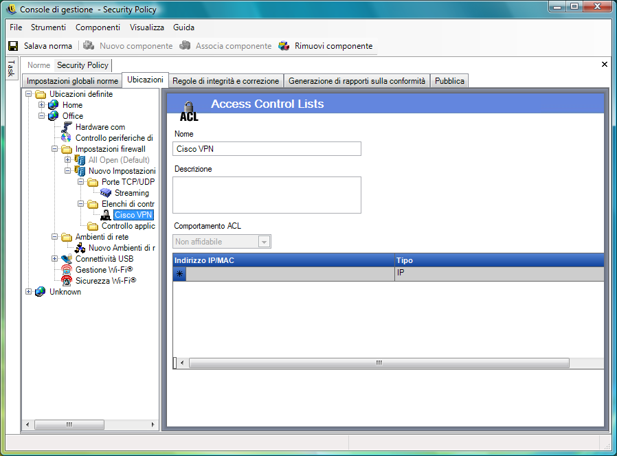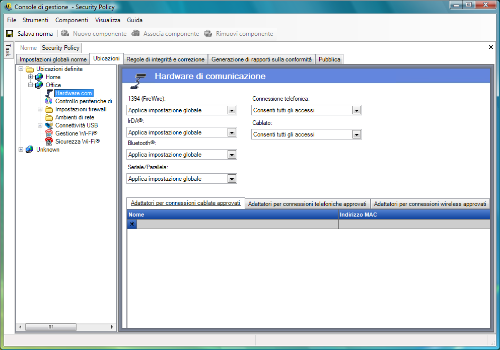 Le impostazioni relative all'hardware di comunicazione controllano, per ogni ubicazione, i tipi di hardware autorizzati ad accedere all'ambiente di rete.
