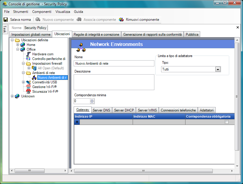 Ambienti di rete rilevati: ZENworks Security Client genera rapporti relativi alle impostazioni di tutti gli ambienti di rete rilevati.