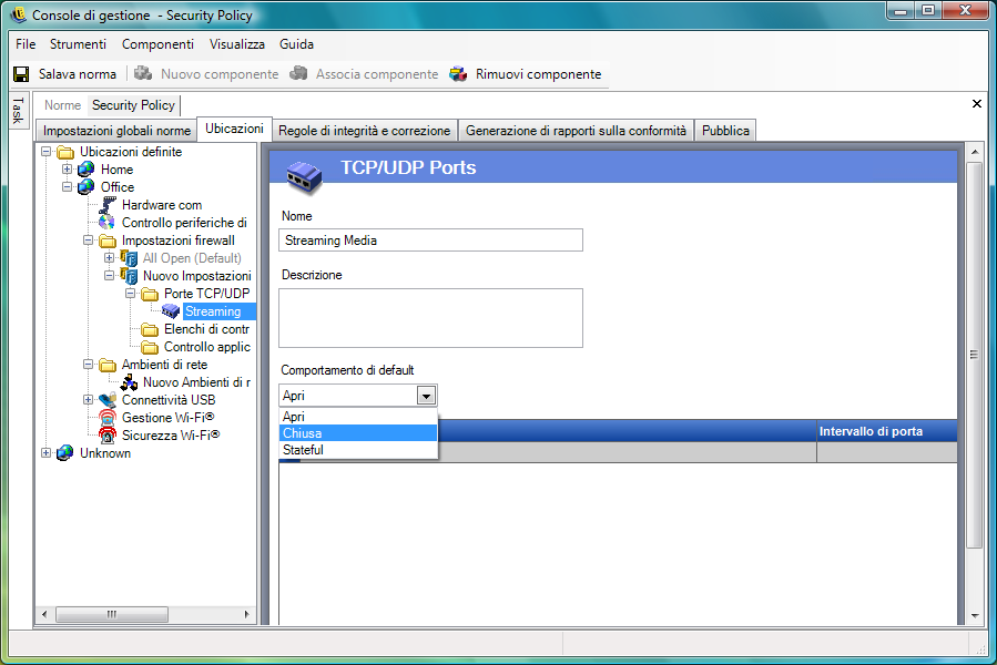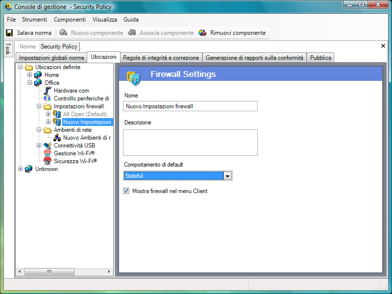 Le norme di sicurezza vengono create definendo tutte le impostazioni globali (comportamenti di default), quindi creando e associando i componenti esistenti per tali norme, ad esempio ubicazioni, firewall e regole di integrità, e infine stabilendo per esse la generazione di rapporti di conformità.