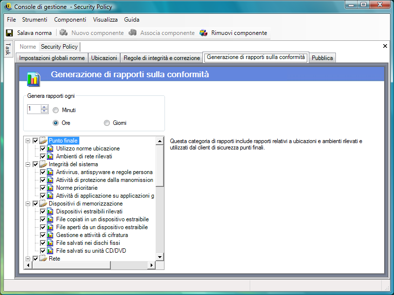 Specificare la frequenza di generazione dei rapporti. Indica la frequenza con cui i dati vengono trasferiti da ZENworks Security Client al servizio di distribuzione norme.
