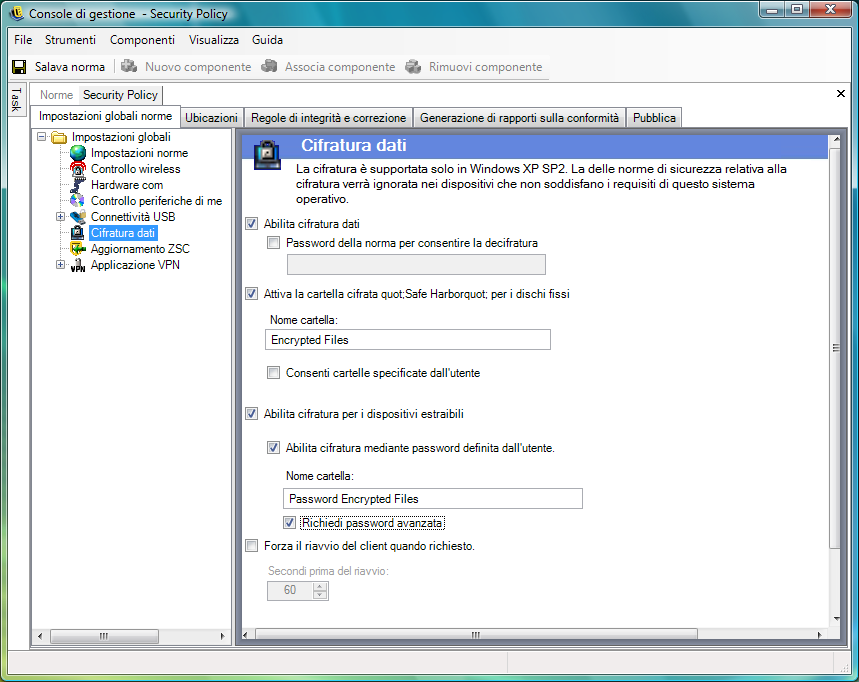 Abilita autodifesa client: L'autodifesa del client può essere abilitata o disabilitata dalle norme. Quando la casella è selezionata, l'autodifesa del client è attiva. Deselezionando la casella l'autodifesa viene disattivata per tutti i punti finali che utilizzano quelle norme.