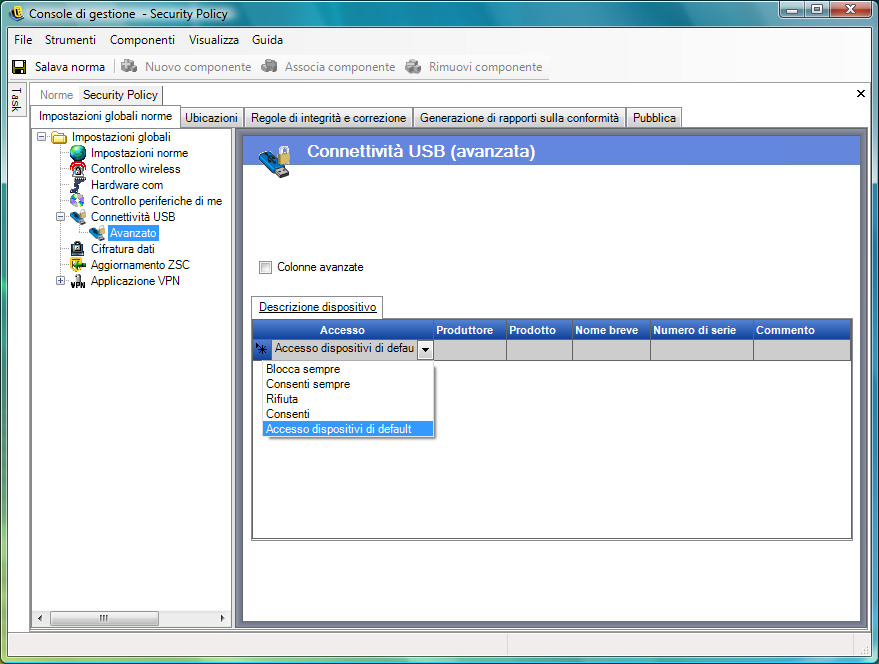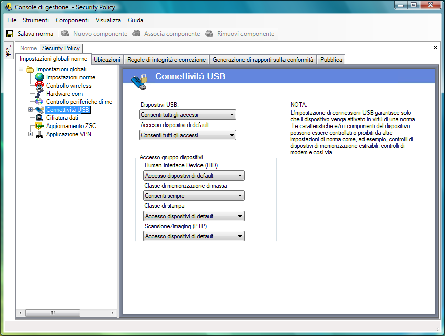 Per tutti i dispositivi che effettuano la connessione tramite il BUS USB, è possibile consentire o non consentire la connessione in base alle norme. I dispositivi possono essere sottoposti a scansione nelle norme dal rapporto Inventario periferiche USB oppure la scansione può essere effettuata su tutti i dispositivi attualmente connessi a un computer. È possibile filtrare i dispositivi in base a produttore, nome prodotto, numeri di serie, tipo e così via. A scopo di supporto, l'amministratore può configurare le norme perché accettino una serie di dispositivi, in base al tipo di produttore (ad esempio, sono consentiti tutti i dispositivi HP) o in base al tipo di prodotto (sono consentiti tutti i dispositivi USB HID, ad esempio mouse e tastiera). Inoltre, è possibile autorizzare singoli dispositivi per evitare l'introduzione nella rete di periferiche non supportate (ad esempio, non sono consentite stampanti fatta eccezione per quella corrente).