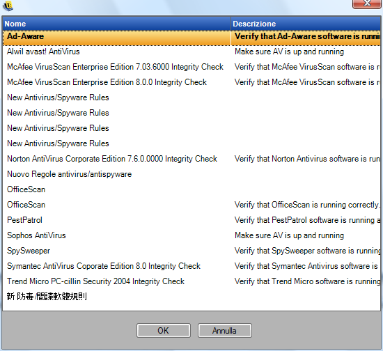 Regole di integrità e correzione: Tali regole assicurano che il software necessario (ad esempio antivirus e antispyware) sia in esecuzione e aggiornato nel dispositivo.