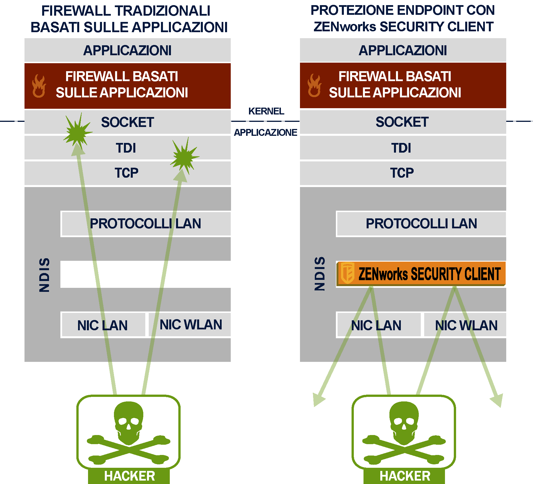 Nell'ambito della sicurezza dei dispositivi mobili, ESM offre funzionalità avanzate rispetto alle tecnologie firewall tradizionali, che funzionano solo a livello applicativo oppure come driver firewall-hook. La sicurezza del client ESM è integrata nel driver Network Driver Interface Specification (NDIS) di ogni scheda di interfaccia di rete (NIC, Network Interface Card) e fornisce protezione immediata dal momento in cui il traffico entra nel computer. La Figura 1-2, Efficienza del firewall a livello di NDIS illustra le differenze tra ESM e i firewall a livello applicativo e i driver filtro.