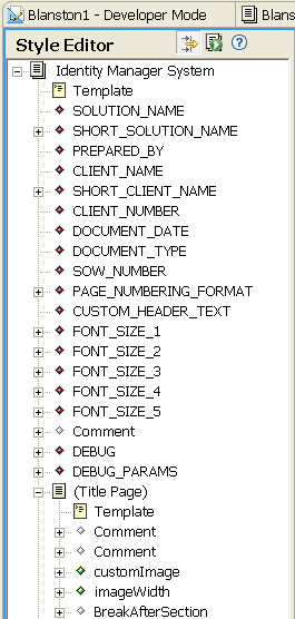 [Identity Manager System]セクションには、セクションのタイトルと多数のタブ(属性)である[Document Properties (ドキュメントのプロパティ)]、[Client Properties (クライアントのプロパティ)]、[Header (見出し)]、[Font Settings (フォントの設定)]、[Other (その他)]があります。各タブには、編集可能なフィールドがあります。例えば、セクションのタイトルの名前は変更できます。[Advanced Editing (高度な編集)]アイコンをクリックすると、[Identity Manager System (Identity Managerシステム)]セクションの見出しの下に、1つのテンプレート、および複数の属性、コントロール、パラメータが含まれていることが分かります。