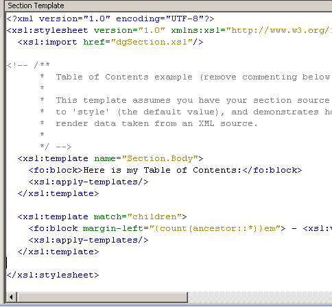 テンプレートには大半がコメントからなるデフォルトのコンテンツが含まれています。これらのコンテンツは初めてテンプレートを使用する際に役立ちます。この方法については次のタスクで説明します。ここでは、このテンプレート内のコメントを次のXSLコマンドで置換します。