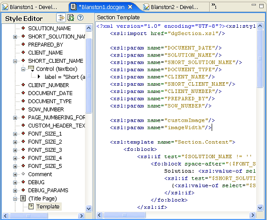 [Advanced Editing (高度な編集)]アイコンを使用すると、簡単な編集モードと高度な編集モードを切り替えることができます。高度な編集モードでは、事前定義のスタイルに添付されているデフォルトのテンプレートとは異なる情報と構造を定義できます。この例では、タイトルページテンプレートがXSL形式で表示されています。このテンプレートの保守はユーザが行います。