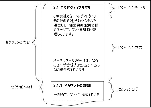 セクションとは、属性、パラメータ、テンプレート、コントロールからなる、XSLで記述されたドキュメントのブロックです。セクションの目次には、Title (タイトル)、Body (本文)、subordinate (下位)情報が含まれます。次の例は、簡単な編集モードで表示したIdentity Manager Systemの[Section Properties (セクションのプロパティ)]ページを示しています。