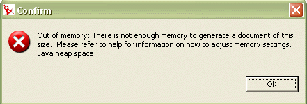 プロジェクトのドキュメントを生成する場合、Designerはすべてのモデル/プロジェクト情報をドキュメントに盛り込みます。Designerのメモリパラメータが使用されていない、またはドキュメント生成処理の実行に十分なメモリがコンピュータにない場合、次のエラーメッセージが表示されます。