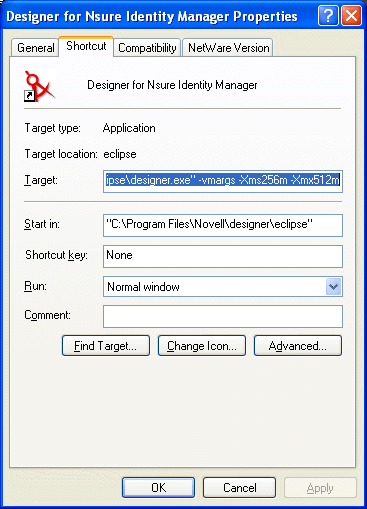 C:\Program Files\Novell\designer\eclipse\designer.exe” -vmargs -Xms256m -Xmx512m