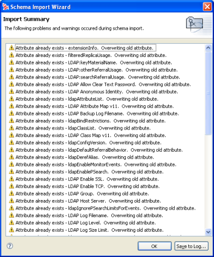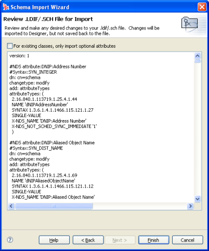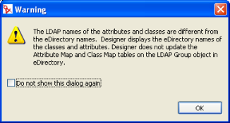 Designer内でのクラス名と属性名はeDirectory名です。LDIFファイル内のクラスと属性の名前はLDAP名であり、双方の名前は異なっています。LDAPファイルをインポートする前に、LDAPファイルに記載されている名前が使用環境にとって正しいものであることを確認してください。LDAPクラス名および属性名にマップされたeDirectoryクラス名および属性名のリストについては、セクション 12.8, eDirectoryからLDAPまでスキーママッピングの表を参照してください。