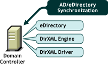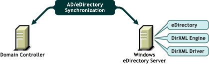 A single Windows domain controller hosts eDirectory, the DirXML engine, and the driver.