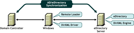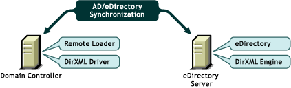 The second configuration places eDirectory and the DirXML engine on one computer and the driver and Remote Loader on the Active Directory domain controller.