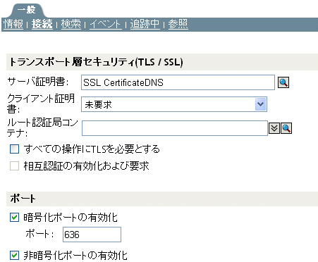 ポート636を通じた接続は暗号化されます。TLS(以前のSSL)によって暗号化が管理されます。デフォルトでは、eDirectoryのインストールではこのポートが選択されます。