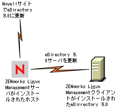 eDirectory 8.8では、ZENworks Linux ManagementサーバがインストールされているホストにeDirectoryをインストールし、その後でZENworks Linux Managementクライアントがインストールされている他のサーバにeDirectoryを展開することができます。