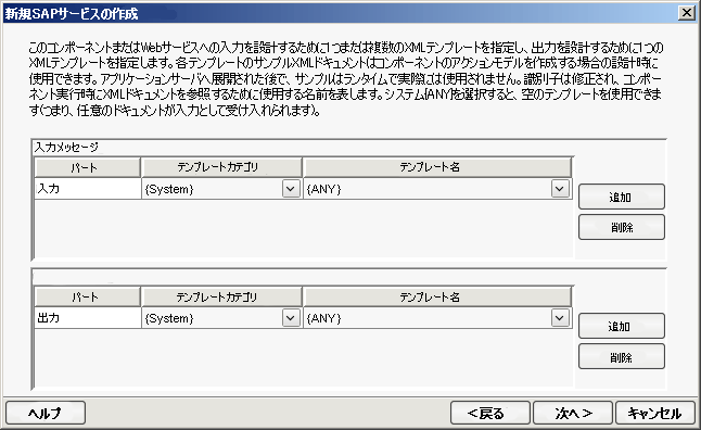このダイアログボックスで、お使いのサービスの入力および出力の設計で使用するXMLテンプレートのサンプルドキュメントを指定します。