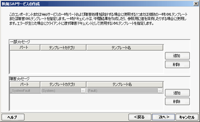 このダイアログボックスには、[SAPサービス要求]と[SAPサービス応答]という2つのタブがあります。これらのタブの使用方法は、アクションの章の[SAP要求]タブをクリックします。から始まる節で説明してあるように、SAP関数アクションのダイアログボックスにある[SAP要求]タブおよび[SAP応答]タブと同じです。詳細については、該当する説明を参照してください。