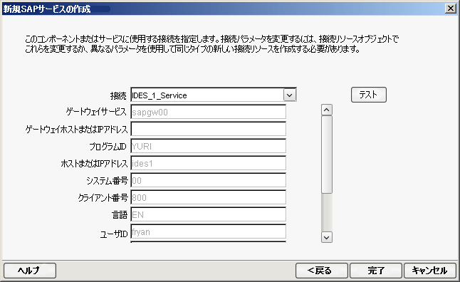 このダイアログボックスで、このSAPサービスで使用する、目的のSAPサービス接続が選択されていることを確認します(コントロールのリストの先頭にある[接続]プルダウンメニューコントロールを使用します)。オプションとして、アクティブな接続があることを確認するために、[テスト]ボタンをクリックします。