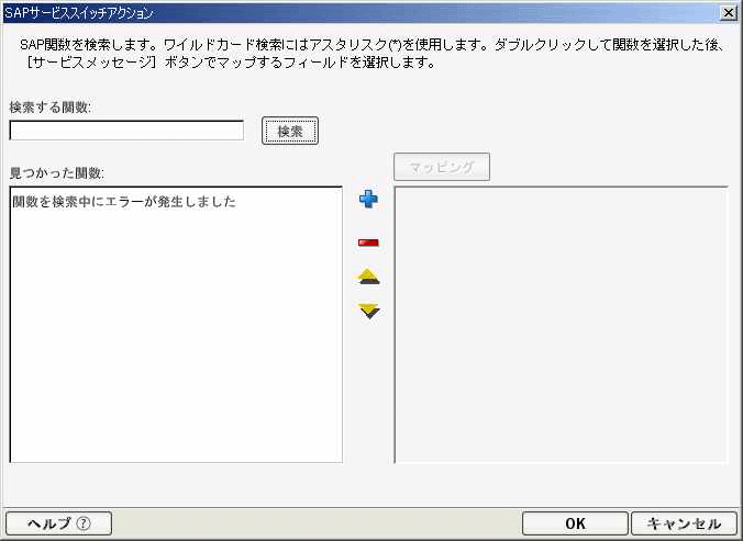 サービスで処理する関数名を指定するには、左側の[見つかった関数]選択リストを使用します。[見つかった関数]で選択した名前を「右」のリストに移動するには、プラス記号アイコンを使用します。右のリストから名前を削除するには、マイナス記号アイコンを使用します(選択した名前の順序を入れ替えるには、上下の矢印を使用します)。右側のリストにある名前は、お使いのSAPサービススイッチアクションで、「case」ブロックの基礎となります。