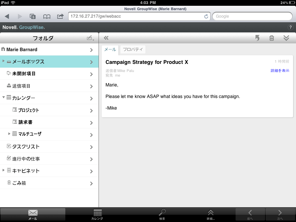 タブレットのWebブラウザからGroupWiseにログインすると、メールボックスが表示されます。